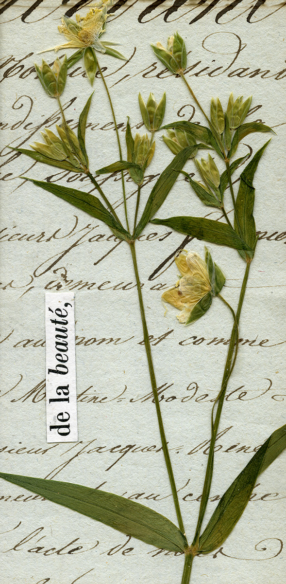 Collage de fleurs séchées, gravure, papier et mots chinés.