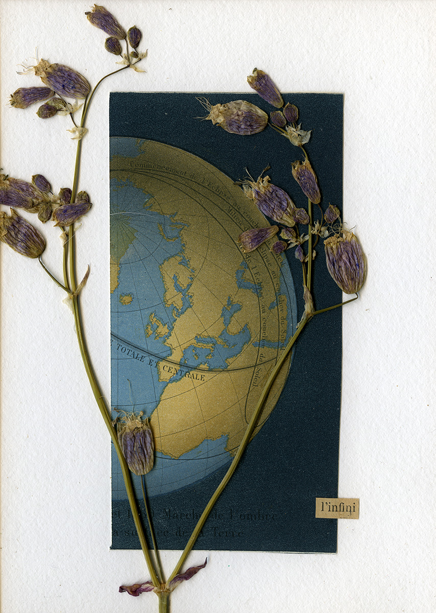 Herbier contemporain Collage de fleurs séchées, gravure originale, mots chinés.