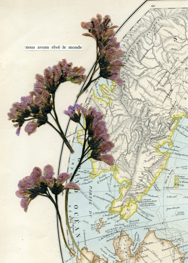 Herbier contemporain : gravure originale, fleurs séchées, mots chinés.